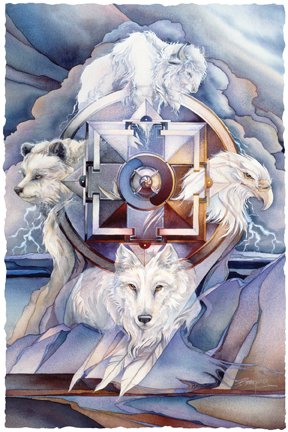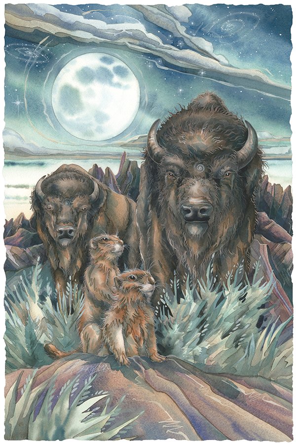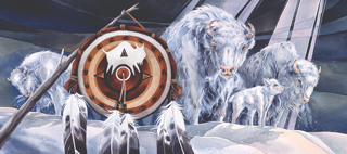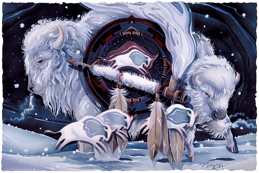 This Buffalo stands under a four directions shield and beneath is a rock painting and a smoking peace pipe. The Lakota people believed that white buffalo calf women gave the pipe to the natives so their prayers could travel on the smoke to the Great Spirit. Here are some meanings for buffalo as totem…