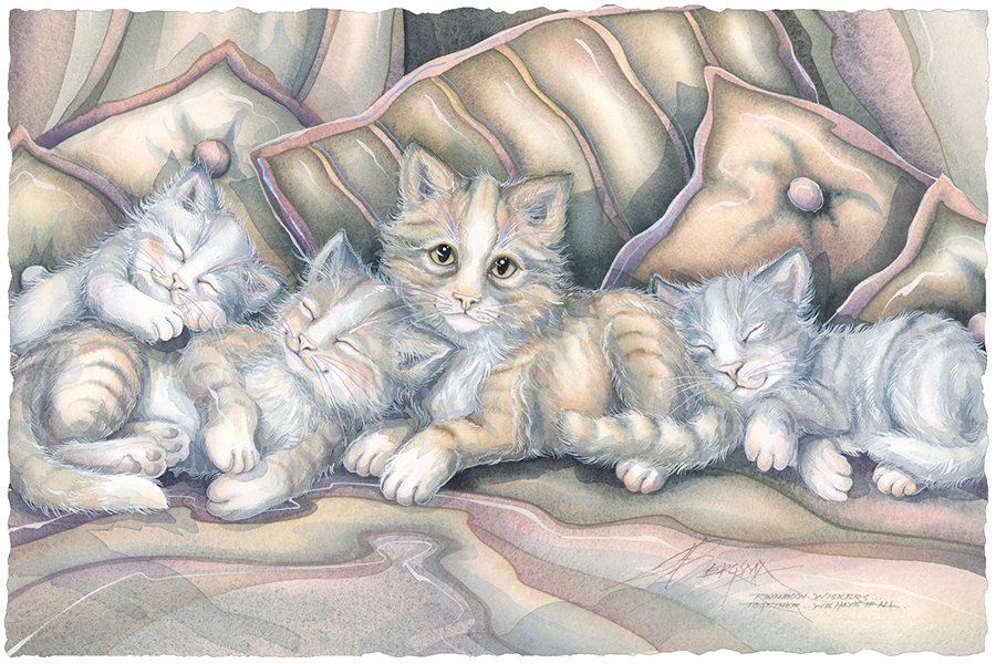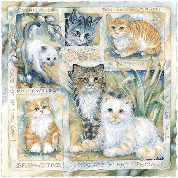 This collage of kitties and phrases create a whimsical portrait for cat lovers. “You are furry special”…”Cats me if you can”…and more, are silly and fun puns that will make you smile.