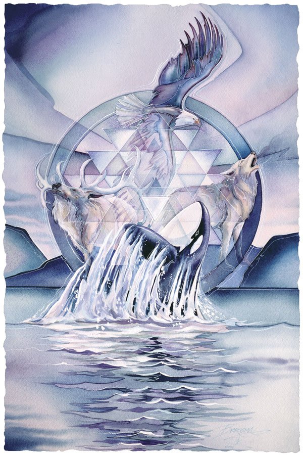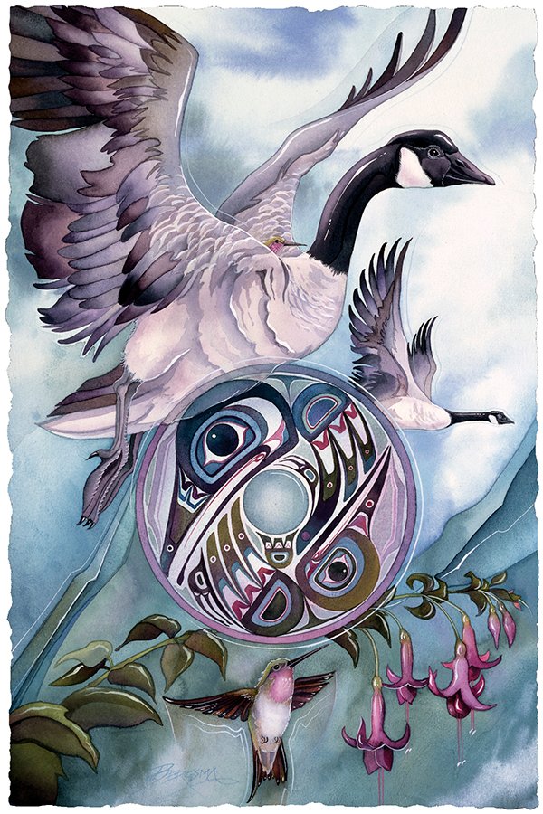 The Natives of the Northwest create beautiful abstracted images of the animals that live around them. !n the center of this bird collage is a Native inspired Eagle design…one of their most revered clans. The eagle is surrounded by a hawk, hummingbird, owl and raven who honor the four directions.