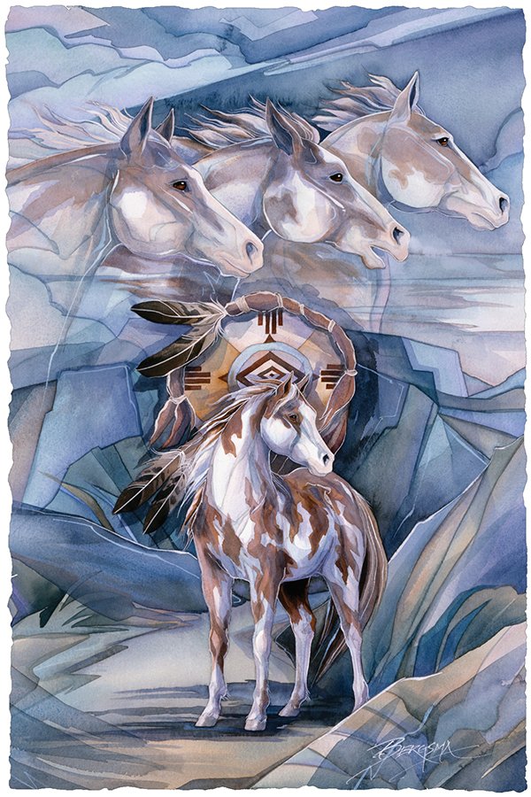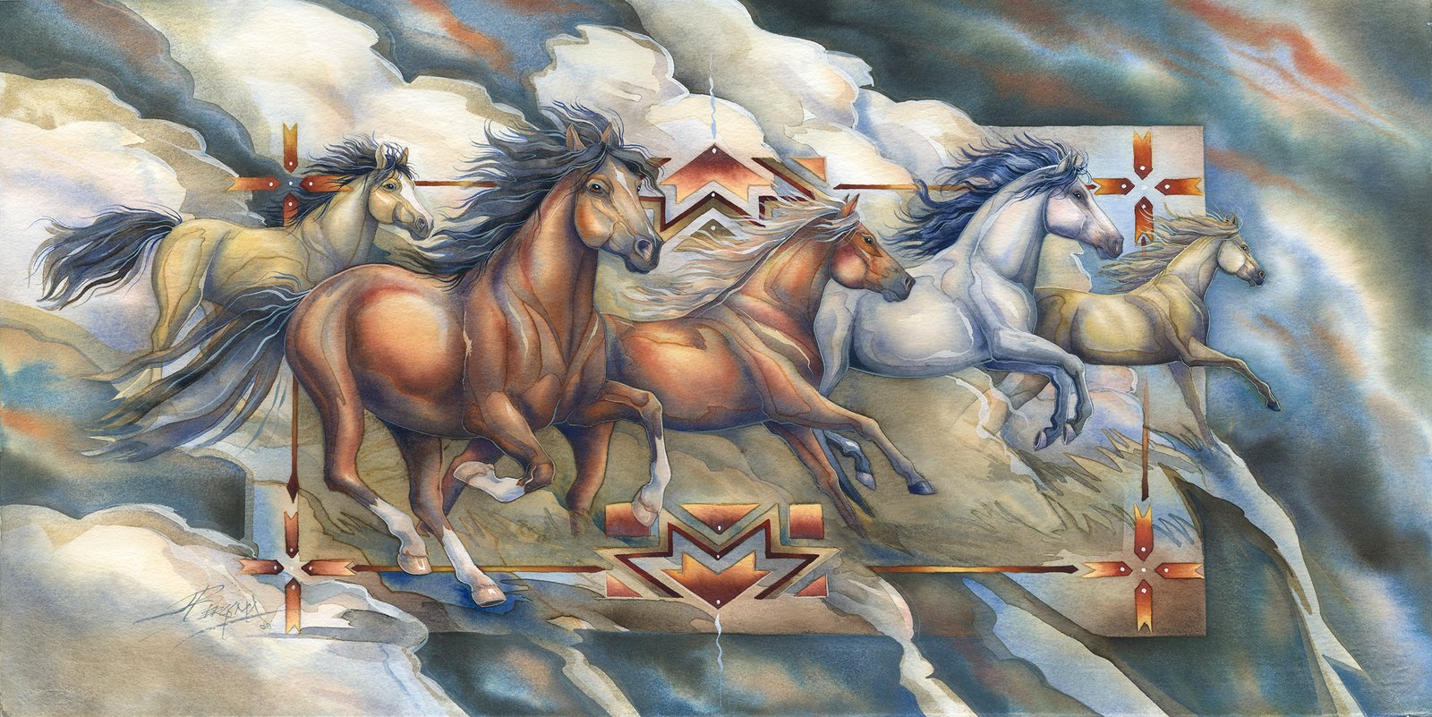Horses transformed the lives of Native Americans. When Natives first captured wild horses, that were introduced by the Spanish in the 1500’s, they changed the way these tribal people lived. Horses greatly enhanced mobility, allowing for faster travel and trade. Horses became valuable assets for trade and hunting, improving livelihoods.  Horses played a central role in ceremonies, storytelling, and tribal identity. Each colored horse was given different powers and meanings.  Paint horses were valued as a bridge between the spiritual and physical realm and celebrated in ceremony. The red horse was honored for abundance and the importance of water in life. Bay horses are associated with loyalty and companionship. Palominos are seen as messengers, conveying wisdom and insights from the spirit realm.