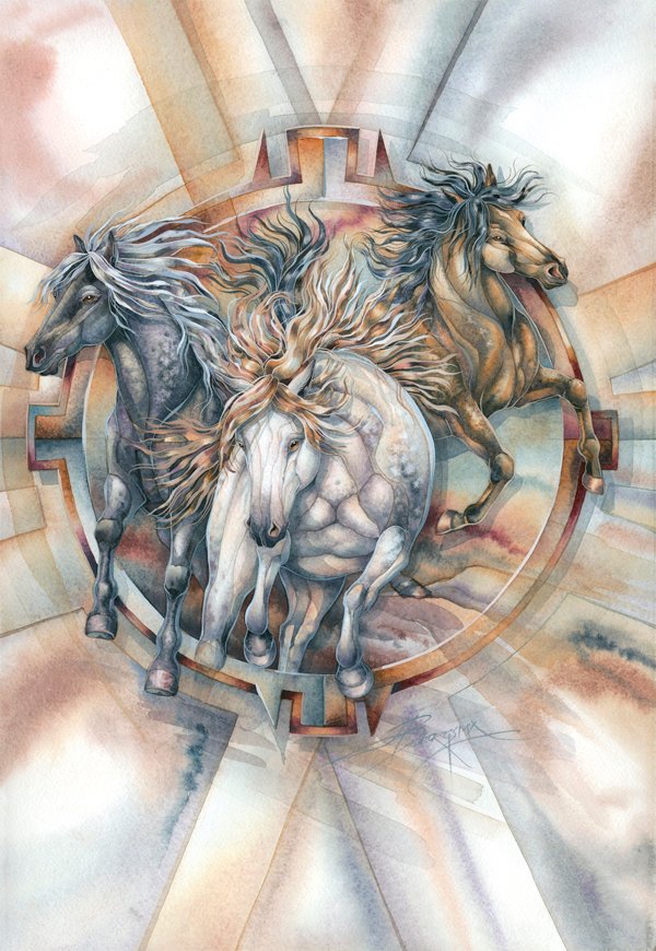 This image has many colored mustangs with a four directions symbol. Here are some meanings for the horse as totem…