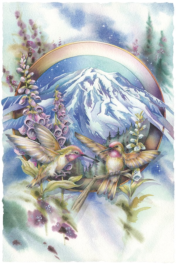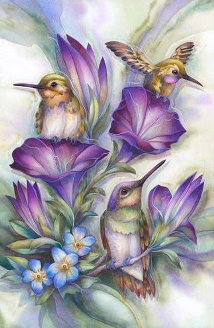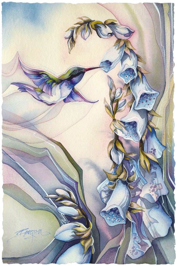 This blue and green hummingbird drinks from a spring foxglove. The energy of nature flows around them in a symphony of pastel greens, blues and lavender. The hummingbird has many meanings.