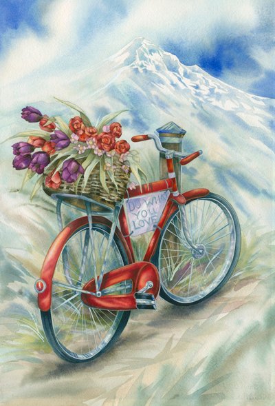 Let the earth rejoice because spring has arrived! The roar of color and the presence of life creates a symphony of joy over the landscapes of Skagit Valley Washington every spring. Here we see a great heron ringed by a circle of tulips…lines of color stretch into the distance with a mountain far away. A small frog and ladybug evades the heron among the blooms.